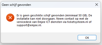 - Deze melding komt in beeld als er een schijf groter dan 50GB gevonden is. Zodra je op OK klikt wordt de schijf gewist en start de installatie.