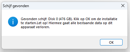 - Deze melding komt in beeld als er een schijf groter dan 50GB gevonden is. Zodra je op OK klikt wordt de schijf gewist en start de installatie.